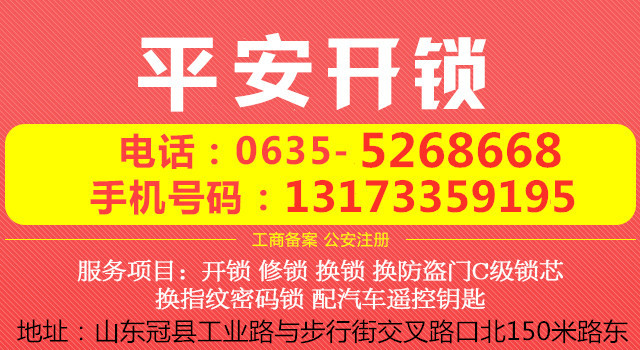 冠县平安开锁公司是冠县第一家正规开锁公司,经公安备案,工商注册的开锁公司,长期以来得到各小区物业和业主的认可,价格合理,公道,服务热情,只要你一个电话,平安开锁以最快的速度到达,解你燃眉之急,因为专业 ...